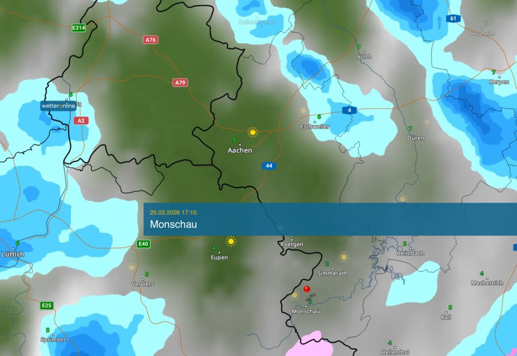 Heute gab es typisches Aprilwetter in der Region. Neben einem stürmischen Wind gab es zahlreiche Regen- und Graupelschauer. Im Tagesverlauf sanken die Temperaturen und die Schneeflocken kämpfen sich aus der Eifel langsam Richtung Niederungen.