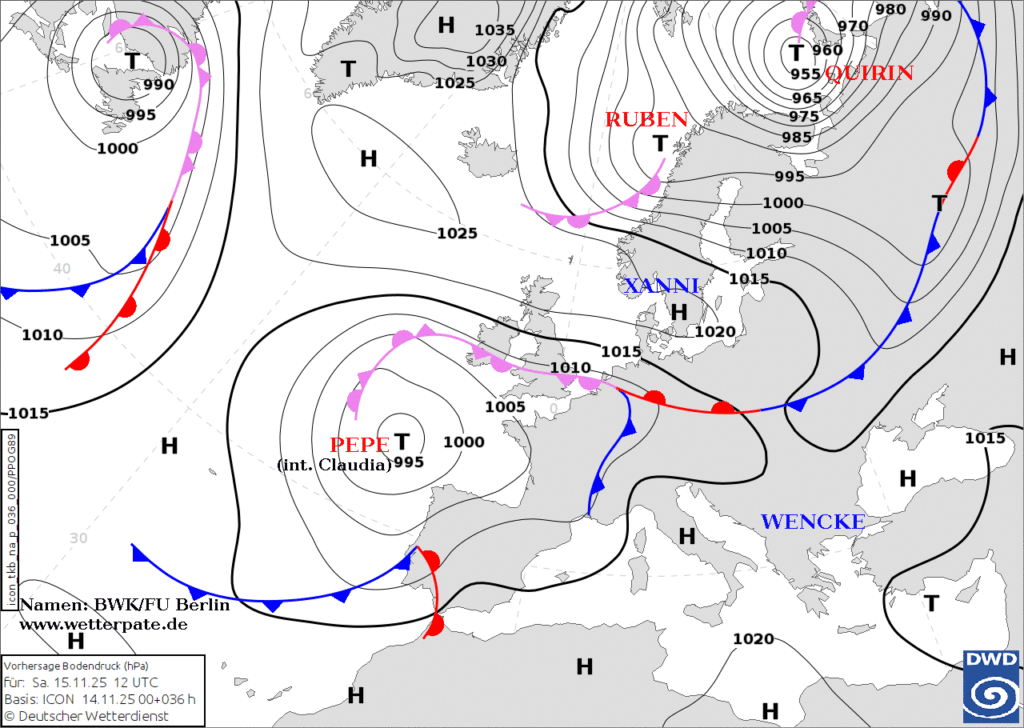 Danach geraten wir in einen Trog, der von Mitteleuropa bis in den Polarkreis reicht. Dabei werden Luftmassen polaren Ursprungs angezapft, die sich über der Nordsee leicht erwärmen. In diesem Trog erreichen uns immer wieder kleine Tiefdruckgebiete.