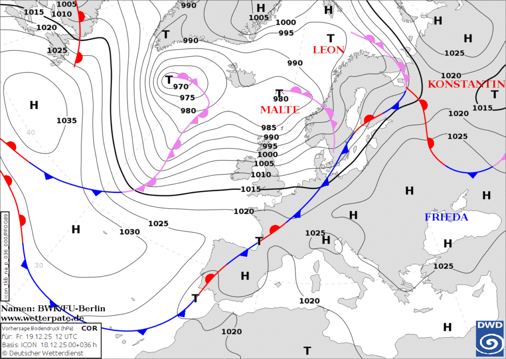 Die kommenden beiden Tage werden nun ziemlich bescheiden. Denn der MALTE bringt sich mit seiner Kaltfront und etwas Regen ins Spiel. Das bedeutet einen bedeckten Himmel, wo es immer wieder mal etwas tröpfeln kann.