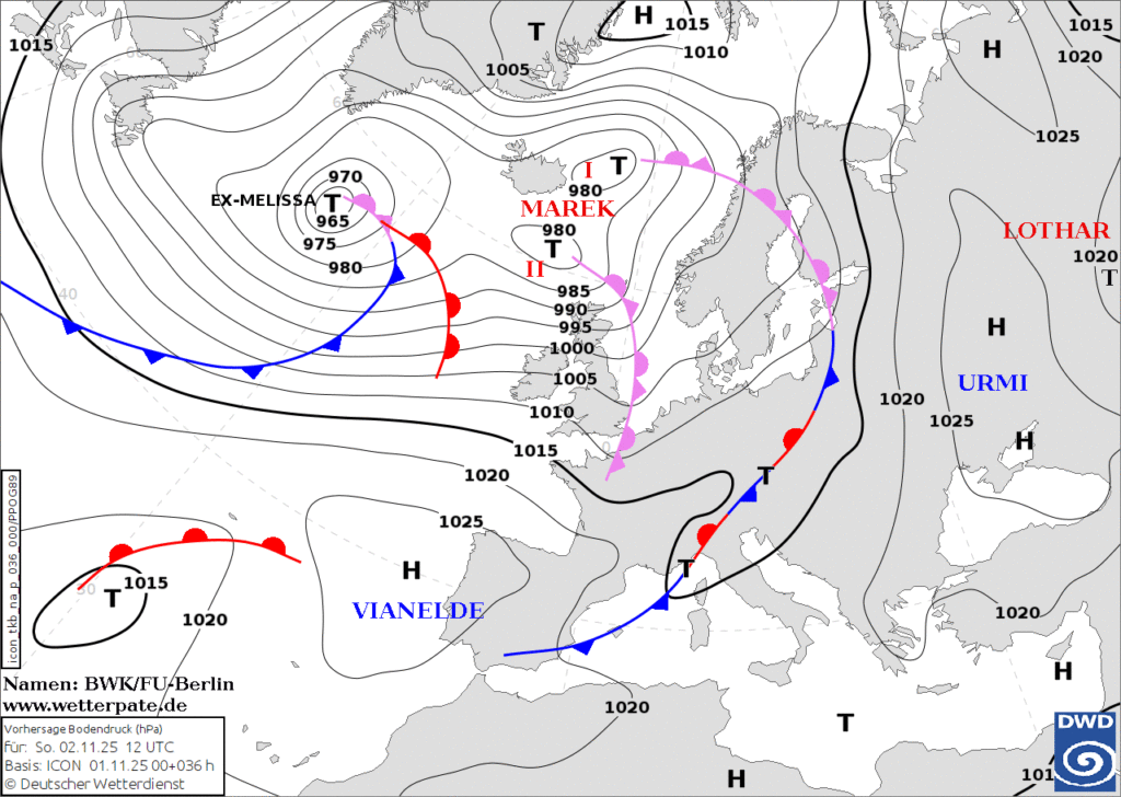 Hoch VIANELDE breitet sich ab morgen in unsere Region aus. Sie wird befeuert von Tief EX-MELISSA, die das Hoch praktisch vor sich her schiebt. Dann wird VIANELDE aber so stark, das sich EX-MELISSA gegen das Tief tot rennt.