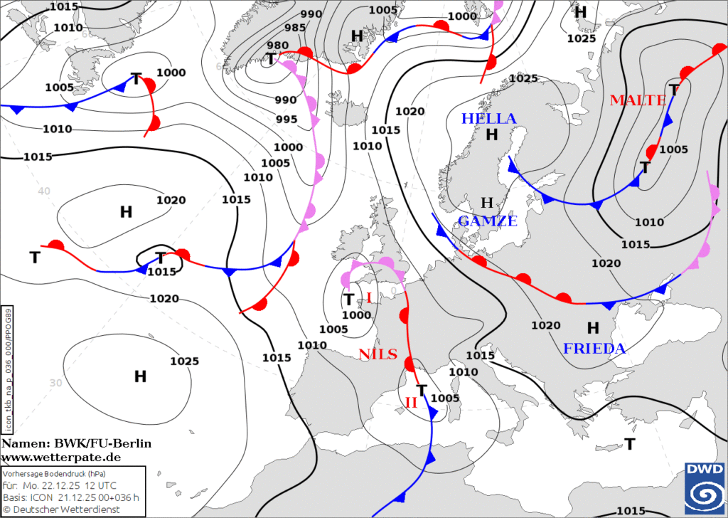 Die Weihnachtswoche startet in ruhigen Bahnen. Hoch GAMZE und HELLA machen sich über Nordeuropa breit und lenken aus Osten zunehmend kalte Kontinentalluft zu uns. Die ist aller dings furztrocken. Und so bleiben die Niederschläge aus.
