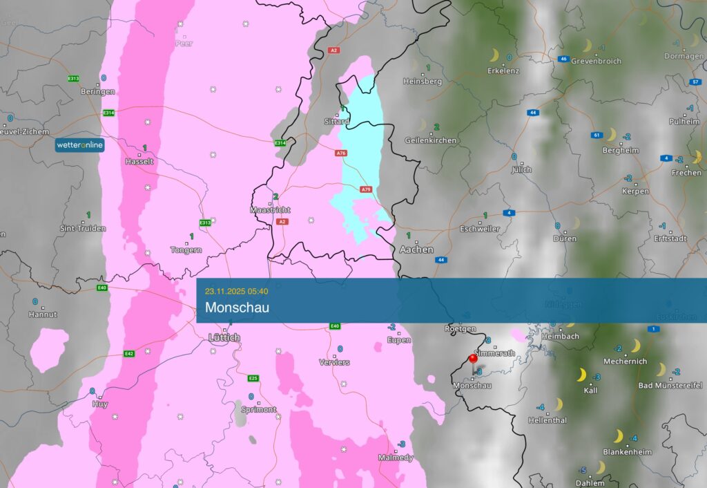 Heute früh sind vielleicht mal ein paar kurze Sonnenstrahlen drin. Rasch zieht es sich aber zu und es setzt in der Eifel kräftiger Schneefall ein. In der restlichen Region geht es mit Schneeregen los, der sich rasch in Regen verdünnisiert. Die Höchstwerte liegen bei 0 bis 4 Grad. Dazu wird es windig.