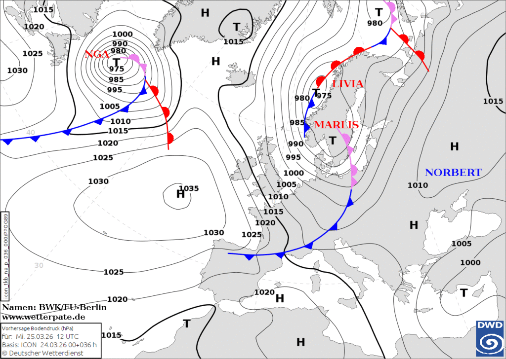 Tief MARLIES brettert heute mit ihrer Kaltfront über uns hinweg. Dazu hat sie Sturmböen und Höhenkaltluft mit im Gepäck. So gibt es verfrühtes Aprilwetter mit Regen-, Graupel- und Schneeschauern. Selbst kurze Gewitter sind in der labilen Luft möglich.