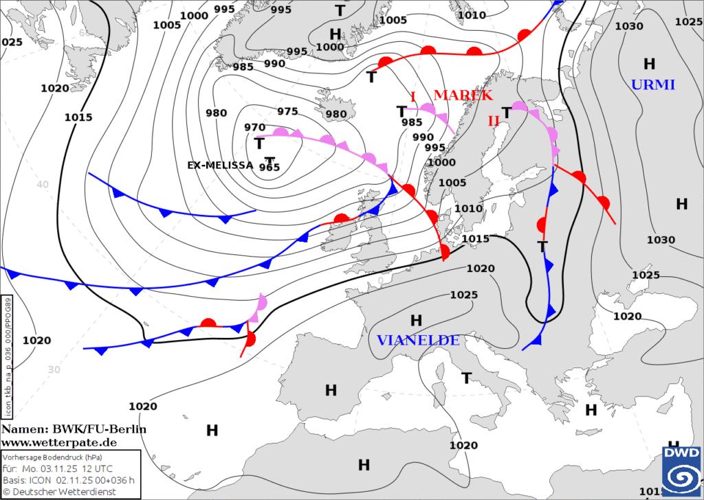 Die erste Novemberwoche steht im Zeichen von Hoch VIANELDE. Die Dame hält den ehemaligen verheerenden Hurrikan MELISSA auf dem Atlantik in Schach. An der Vorderseite dieser Konstellation wird sehr milde Meeresluft zu uns transportiert.