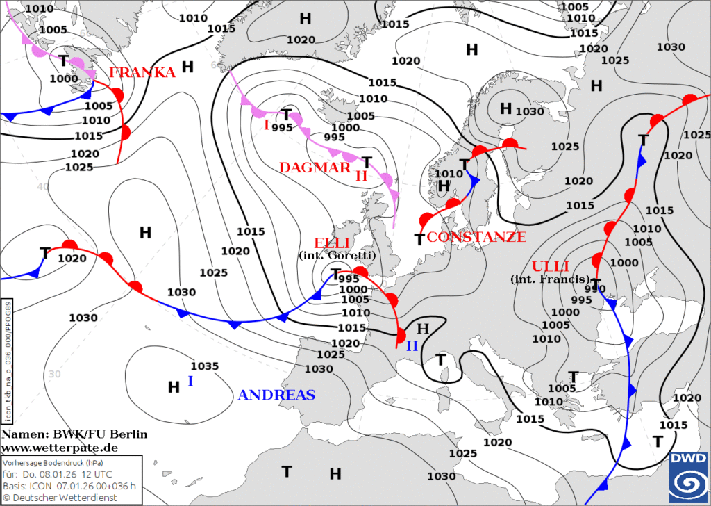 CONSTANZE und DAGMAR dominieren mit einem Trog das Wetter in Mitteleuropa. Wir liegen heute zwischen den Stühlen. Das kleine aber heftige Sturmtief ELLI macht sich auf den Weg zu uns und erreicht uns heute Abend mit ihrer Warmfront.