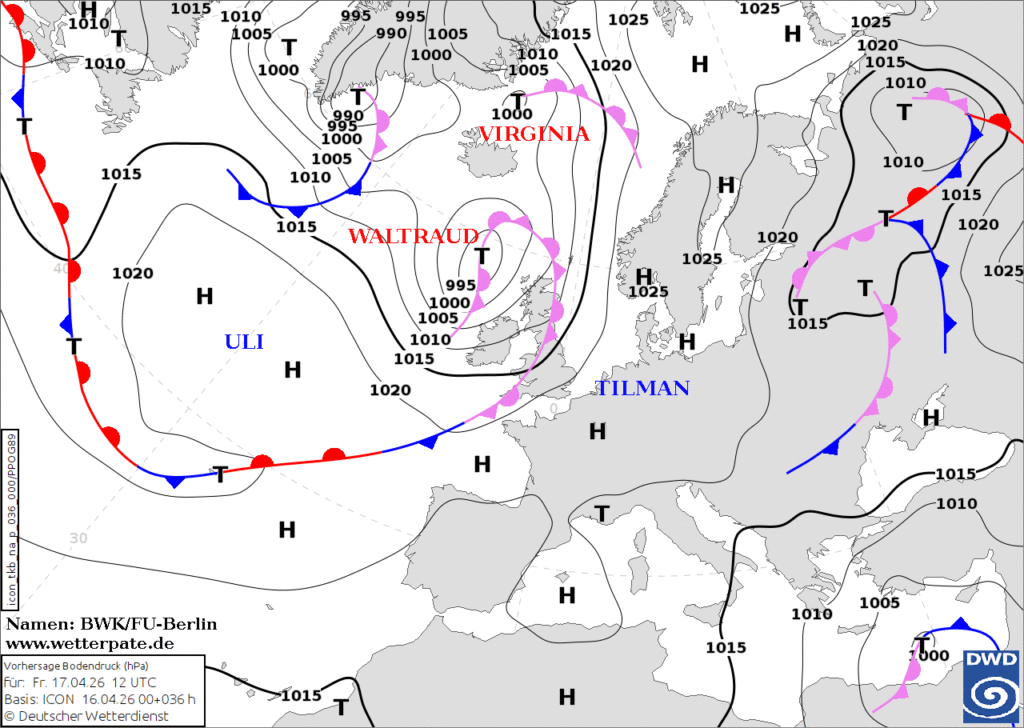 Heute ist noch der TILMAN für uns wetterbestimmend. An der Vorderseite von Tief WALTRAUD wird warme Meeresluft zu uns gelenkt. Morgen gerät diese Luftmasse quasi unter die Räder von der aufkommenden Kaltfront.