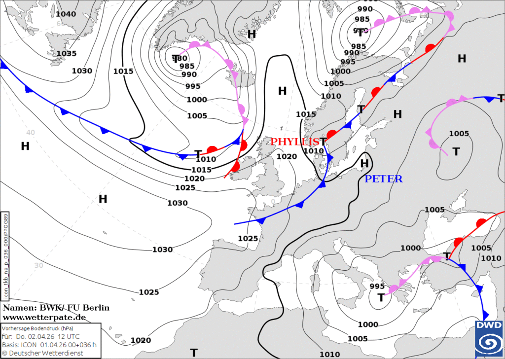 Hoch PETER ist heute schon wieder Geschichte. Tief PHYLLIS erreicht uns gegen Mittag mit ihrer Kaltfront. Viel Regen hat sie allerdings nicht im Gepäck. Am Karfreitag sorgt dann ein Zwischenhoch für ruhigeres Wetter.