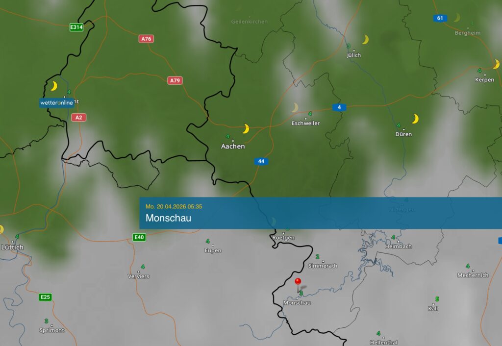 In der Nacht auf Dienstag wird es stark bewölkt. Eine Mischfront zieht mit etwas Regen, in der Eifel auch Schnee, über uns hinweg. Die Temperaturen gehen auf 4 bis 0 Grad zurück.